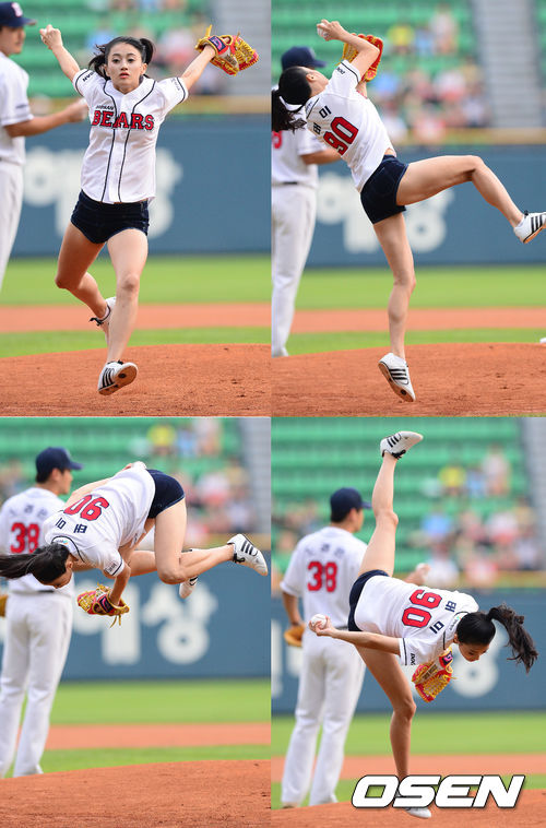 17일 오후 서울 잠실구장에서 열린 '2013 한국야쿠르트 세븐 프로야구' 두산 베어스와 SK 와이번스의 경기에 앞서 배우 태미가 시구를 펼치고 있다.