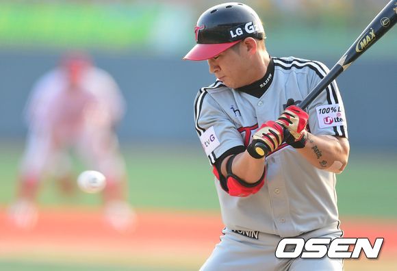 1회초 LG 공격 2사 만루 상황 7번타자 오지환의 KIA 선발 소사의 몸쪽 공에 눈을 질끈 감고 있다. 결과는 몸에 맞는 볼로 밀어내기 타점.