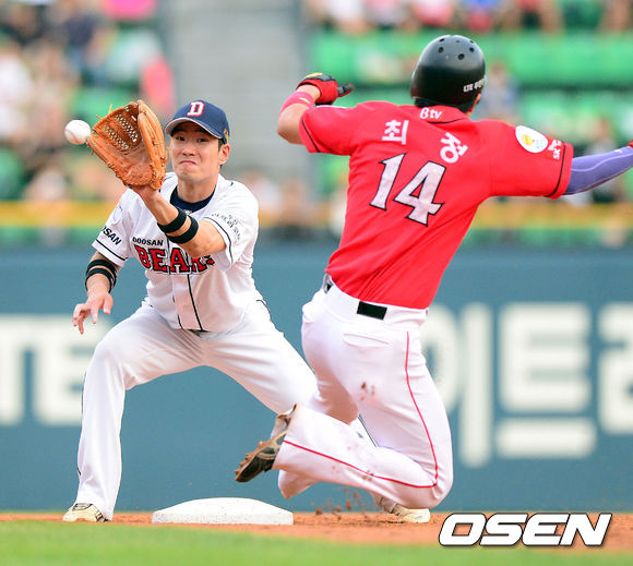 17일 오후 서울 잠실구장에서 열린 '2013 한국야쿠르트 세븐 프로야구' 두산 베어스와 SK 와이번스의 경기, 1회초 1사 1루 SK 박정권의 타석때 1루 주자 최정이 도루 실패하고 있다.