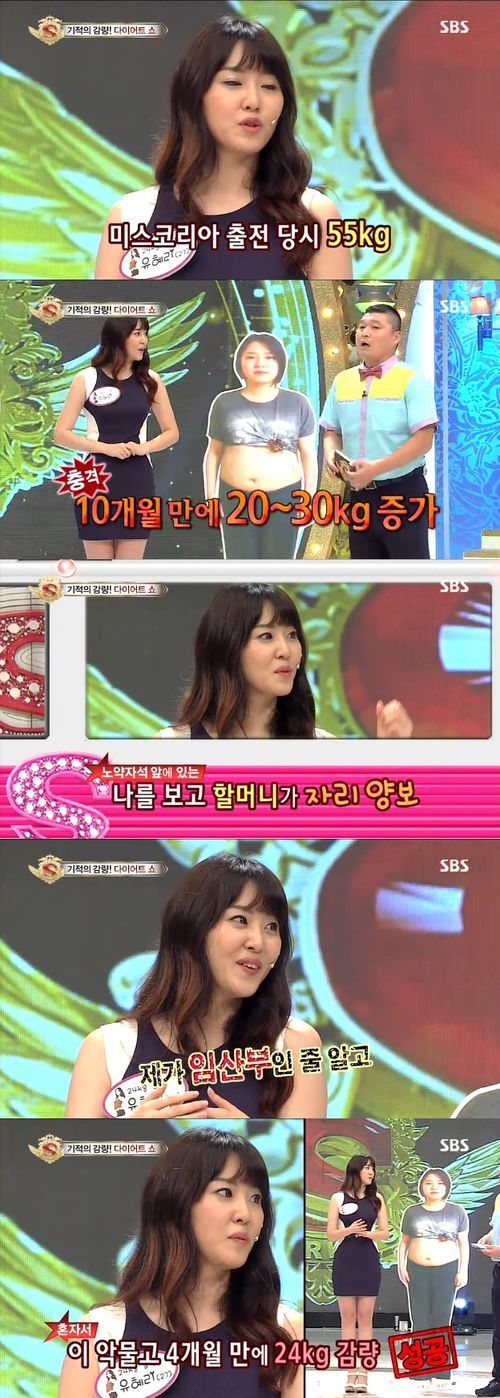 유혜리는 미스코리아 출전 당시 55kg이었다. 하지만 회사 입사 후 잦은 야근에 스트레스, 야식 때문에 10개월만에 20~30kg이 쪘다.