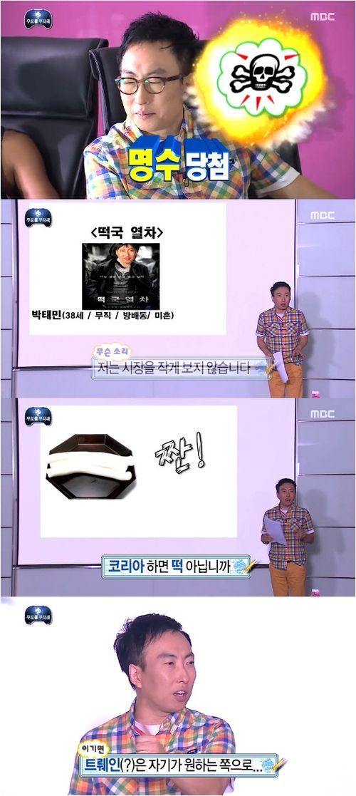 박명수는 “떡과 열차를 연결했다. 기차 타고 최고의 떡을 맛보는 게임이다”고 말해 멤버들을 당황하게 했다. 기차를 타고 칸 마다 배치돼 있는 떡을 먹는 단순한 게임인 것. 박명수의 ‘떡국열차’ 제안에 멤버들은 웃음꽃을 피웠다.