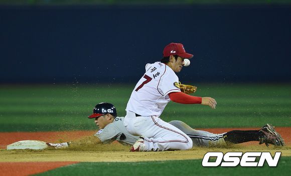 6회초 LG 공격 2사 1루 상황 1루 주자 오지환이 2루 도루에 성공하고 있다.