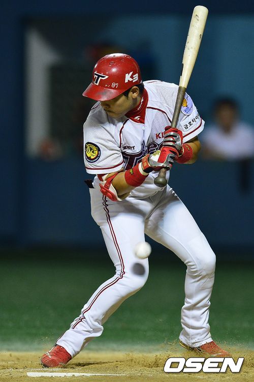 6회말 KIA 공격 1사 주자없는 상황 1번타자 이용규가 LG 선발 류제국의 공에 몸을 맞고 있다.