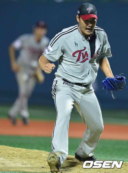 7회말 KIA 공격 2사 3루 상황 LG 투수 이동현이 9번타자 이홍구를 삼진 아웃 시킨 뒤 환호하며 더그아웃으로 들어오고 있다.
