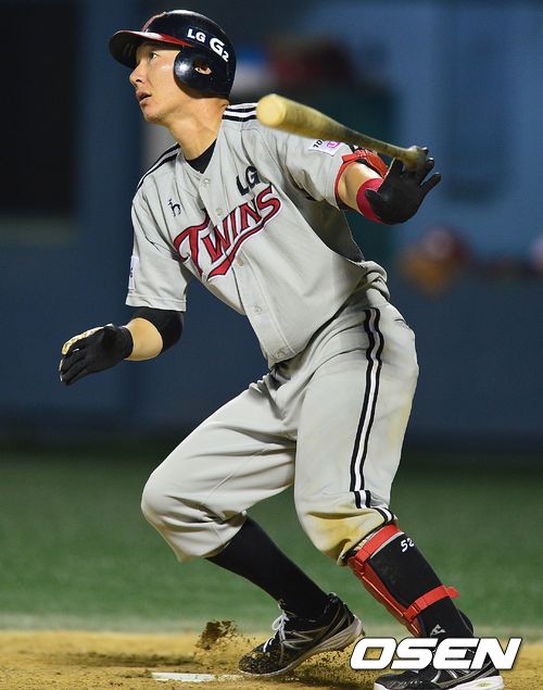 8회초 LG 공격 2사 주자없는 상황 손주인이 좌측 2루타를 날리고 타구를 바라보고 있다.
