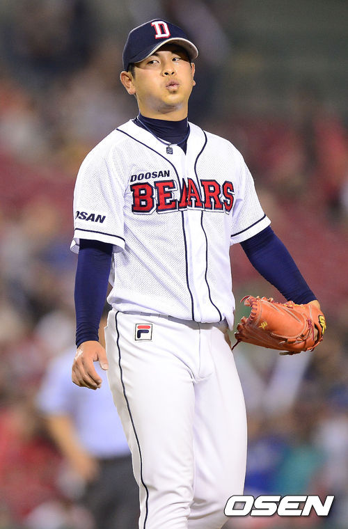 경기종료후 두산 윤명준이 무실점으로 세이브를 올린후 안도의 한숨을 쉬고 있다. / soul1014@osen.co.kr