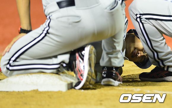 9회초 LG 공격 1사 2루 상황 3루 도루에 성공한 주자 박용택이 그라운드에 쓰려져 고통을 호소하고 있다.