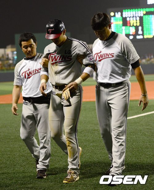 9회초 LG 공격 1사 2루 상황 3루 도루에 성공한 주자 박용택이 부상을 입고 팀닥터의 부축을 받으며 그라운드를 나서고 있다. 이후 박용택은 대주자 신재웅으로 교체됐다.
