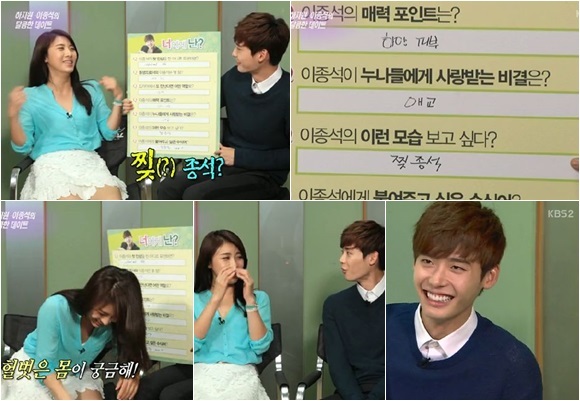 하지원은 17일 오후 방송된 KBS 2TV '연예가중계'에서 '이종석의 이런 모습 보고 싶다'라는 물음에 "찢종석"이라 답해 웃음을 자아냈다. 하지원은 "지금까지는 샤방샤방한 우유같은 느낌인데..보지 않았으니깐 남자다운..(매력을 보고 싶다)"고 설명을 덧붙였다.