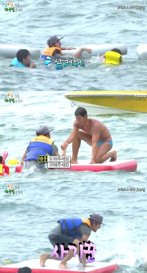 이날 엄태웅과 차태현은 바다에서 안전요원팀과 수상 대결을 펼쳤다.
