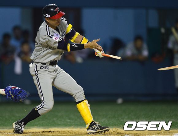 6회초 LG 공격 무사 1루 상황 6번타자 정성훈이 우전 안타를 날릴 때 배트가 부러지고 있다.