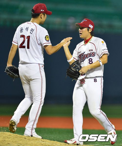경기를 마무리지은 KIA 투수 윤석민과 역전 결승타를 날린 안치홍이 인사를 나누고 있다./dreamer@osen.co.kr