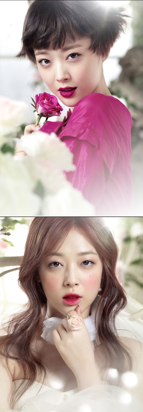 화보 속 설리는 특유의 희고 깨끗한 피부에 꽃봉오리 같이 그러데이션 된 립 메이크업으로 순수의 절정을 이루고 있다. 끝을 살짝 올린 아이라인과 활짝 핀 장미꽃 같은 풀 컬러링 버건디 립 메이크업은 매혹의 극치를 보여준다.