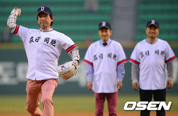 지난 4월 4일 SK-두산 잠실경기에서 지난 1982년 봉황대기 고교야구에 재일동포 학생야구단 멤버로 출전해 예선전부터 결승전까지 총 6게임을 완투한 양시철씨가 시구를, 당시 주전 외야수로 활약한 재일동포 김근씨가 시타를 하고 있다