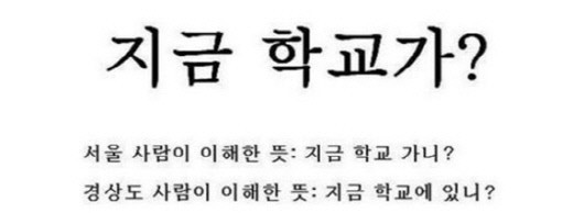 '경상도 사람만 아는 말'에 따르면 '지금 학교가?'라는 문장을 경상도 사람들과 그 외 지역 사람들이 이해하는 뜻이 다르다. 일반적으로 '지금 학교가?'는 '지금 학교 가니?", "지금 학교 가고 있니?' 등으로 해석된다. 하지만 경상도에서는 '지금 학교에 있니?'로 해석이 된다. 한 문장이지만 전혀 다른 뜻으로 해석되는 예다.
