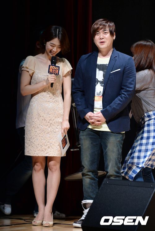 문희준이 포토타임 중 진행을 하는 강지영 아나운서에게 장난을 치고 있다.
