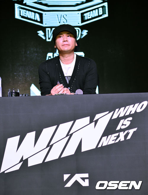 20일 오후 서울시 영등포구 여의도동 콘래드 서울 호텔 그랜드 볼룸에서 열린 YG 신인남자그룹 데뷔 서바이벌 프로그램 'WIN : WHO IS NEXT' 제작발표회에서 양현석이 질문을 듣고 생각에 잠겨있다.