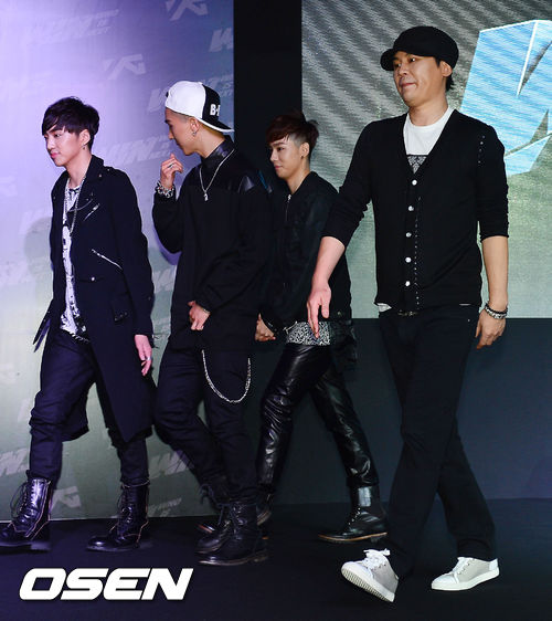 20일 오후 서울시 영등포구 여의도동 콘래드 서울 호텔 그랜드 볼룸에서 열린 YG 신인남자그룹 데뷔 서바이벌 프로그램 'WIN : WHO IS NEXT' 제작발표회에서 양현석 대표가 팀 원들과 함께 퇴장하고 있다.