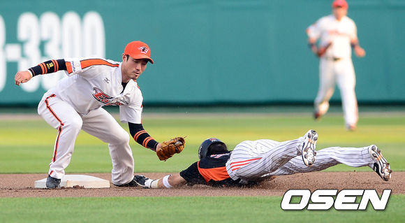 20일 오후 대전 한밭종합운동장 야구장에서 열린 '2013 한국야쿠르트 세븐 프로야구' 한화 이글스와 롯데 자이언츠의 경기 1회초 1사 1루 손아섭 타석, 1루주자 정훈이 도루에 실패하고 있다.