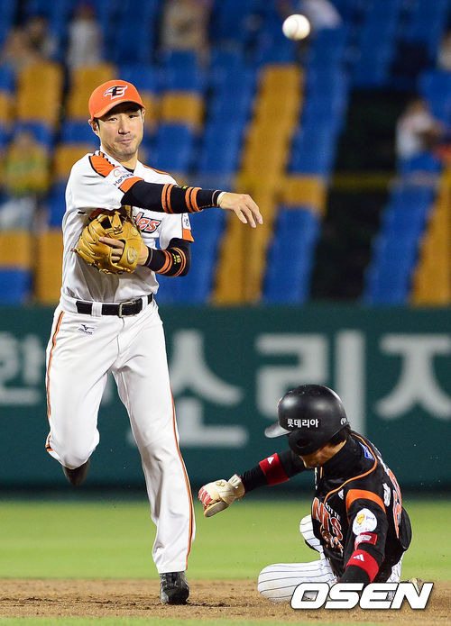 20일 오후 대전 한밭종합운동장 야구장에서 열린 '2013 한국야쿠르트 세븐 프로야구' 한화 이글스와 롯데 자이언츠의 경기 5회초 무사 1루 황재균의 병살타를 한상훈이 2루에서 황성용을 포스아웃 시킨 후 1루로 송구하고 있다.