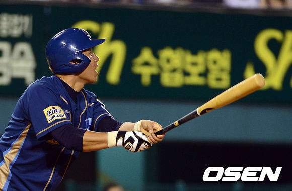 20일 오후 서울 잠실구장에서 열린 '201 한국야쿠르트 세븐 프로야구' 두산 베어스와 NC 다이노스의 경기, 5회초 1사 1,3루 NC 조영훈이 좌익수 희생플라이로 3루 나성범을 홈으로 불러들이고 있다.