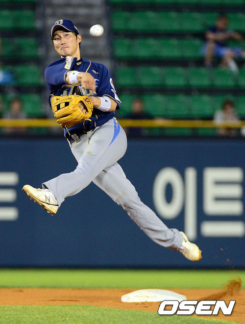 20일 오후 서울 잠실구장에서 열린 '201 한국야쿠르트 세븐 프로야구' 두산 베어스와 NC 다이노스의 경기, 6회말 무사 NC 이상호가 두산 민병헌의 내야땅볼 타구를 잡아 1루로 송구하고 있다. 결과는 1루 세이프.