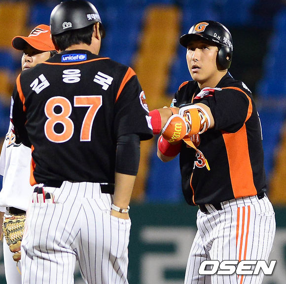 20일 오후 대전 한밭종합운동장 야구장에서 열린 '2013 한국야쿠르트 세븐 프로야구' 한화 이글스와 롯데 자이언츠의 경기 9회초 1사 1,3루 황재균이 1타점 2루타를 치고 2루에서 김응국 코치에게 장비를 건내고 있다.