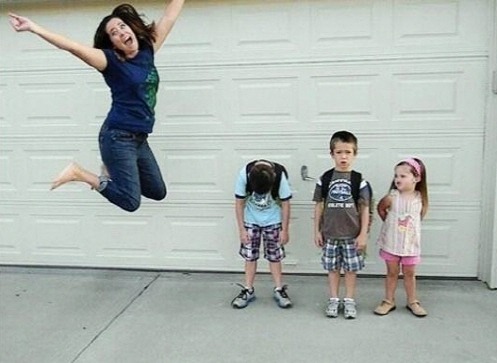 공개된 사진 속에는 책가방을 짊어진 3명의 아이들 바로 옆에 한 여성이 펄쩍 뛰어오르고 있다. 특히 아이들의 표정은 잔뜩 찡그러져 있는 반면 엄마처럼 보이는 여성의 표정은 그야말로 기쁨으로 넘쳐 흐르고 있다. 더구나 3명의 아이 중 한 명은 고개를 푹 숙이고 있는 데 반해 엄마는 양팔을 높이 들어 상반된 감정을 내보였다.