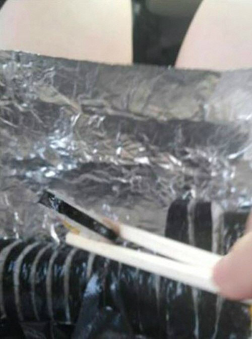 보통 김밥에는 밥과 여러가지 재료들을 넣어 한입 크기로 썬 모양이지만 이 김밥은 초슬림형을 자랑해 김밥인지 의심을 자아내게 한다.