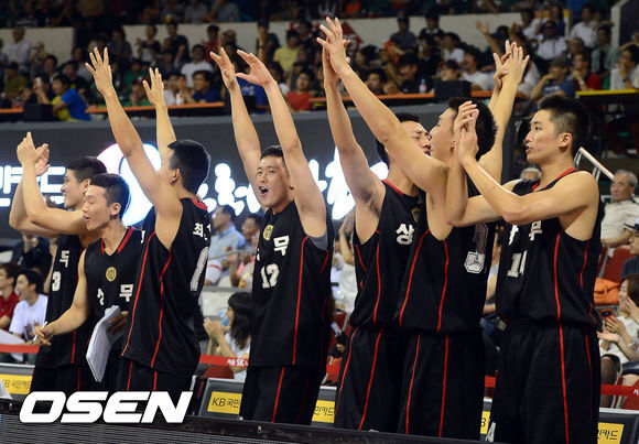 4쿼터, 승리가 확실시 된 상무 선수들이 기뻐하고 있다. /ouxou@osen.co.kr