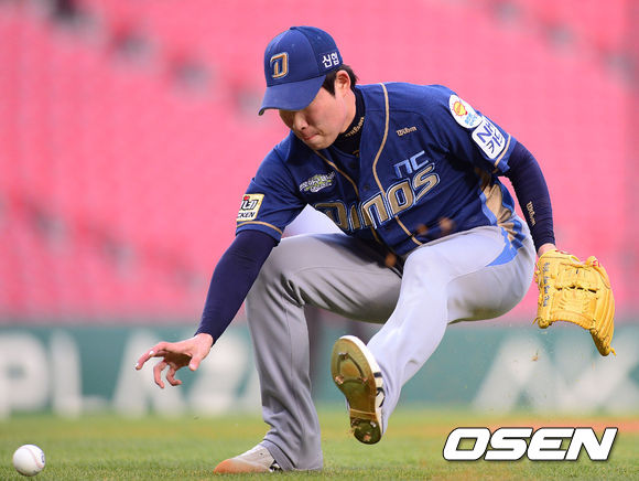 21일 오후 서울 잠실구장에서 열린 '201 한국야쿠르트 세븐 프로야구' 두산 베어스와 NC 다이노스의 경기 1회말 무사 1루 두산 정수빈의 기습번트때 NC 이재학이 공을 줍고 있다