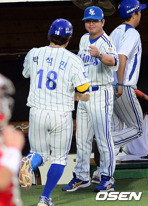 21일 오후 대구구장에서 열린 '2013 한국야쿠르트 세븐 프로야구' 삼성 라이온즈와 SK 와이번스의 경기 2회말 1사 박석민이 솔로포를 친 후 덕아웃에서 류중일 감독과 하이파이브를 하고 있다.