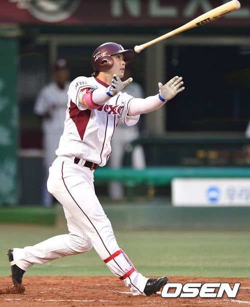 2회말 넥센 공격 2사 1루 상황 8번타자 서동욱이 선제 우월 투런포를 날리고 타구를 바라보고 있다.