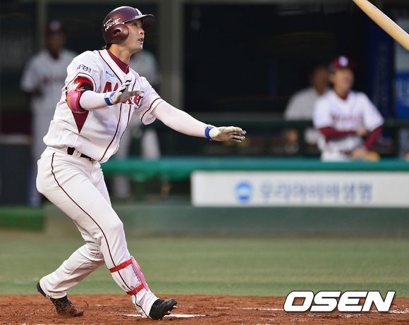 2회말 넥센 공격 2사 1루 상황 8번타자 서동욱이 선제 우월 투런포를 날리고 타구를 바라보고 있다.