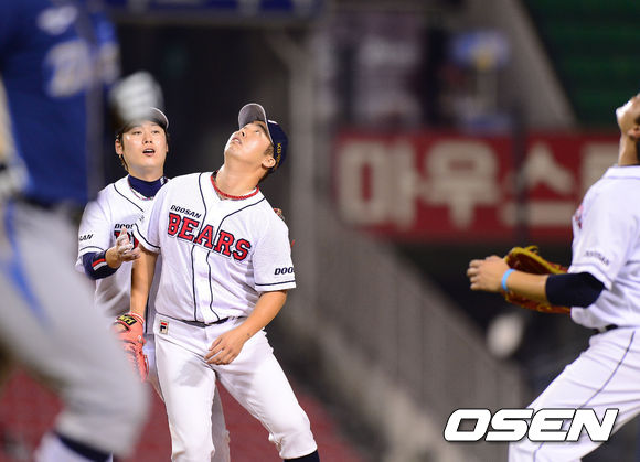 21일 오후 서울 잠실구장에서 열린 '201 한국야쿠르트 세븐 프로야구' 두산 베어스와 NC 다이노스의 경기 4회초 1사 1루 NC 이호준의 내야플라이때 두산 선발투수 유희관과 이원석 3루수 1루수 오재일이 공을 바라보고 있다.