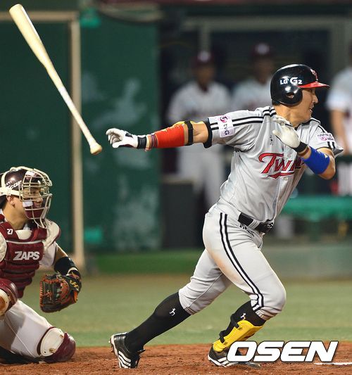 5회초 LG 공격 1사 만루 상황 3번타자 이진영이 동점 1타점 중전안타를 날리고 있다.