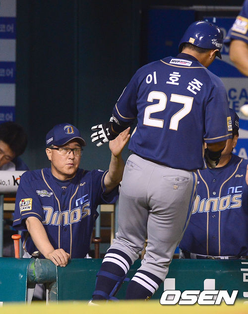 21일 오후 서울 잠실구장에서 열린 '201 한국야쿠르트 세븐 프로야구' 두산 베어스와 NC 다이노스의 경기 6회초 1사 NC 이호준이 역전 솔로홈런을 날리고 김경문 감독의 축하를 받고 있다