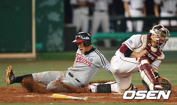 7회초 LG 공격 1사 2루 상황 1번타자 박용택의 역전 1타점 중전안타 때 주자 정주현이 홈에 세이프되고 있다.