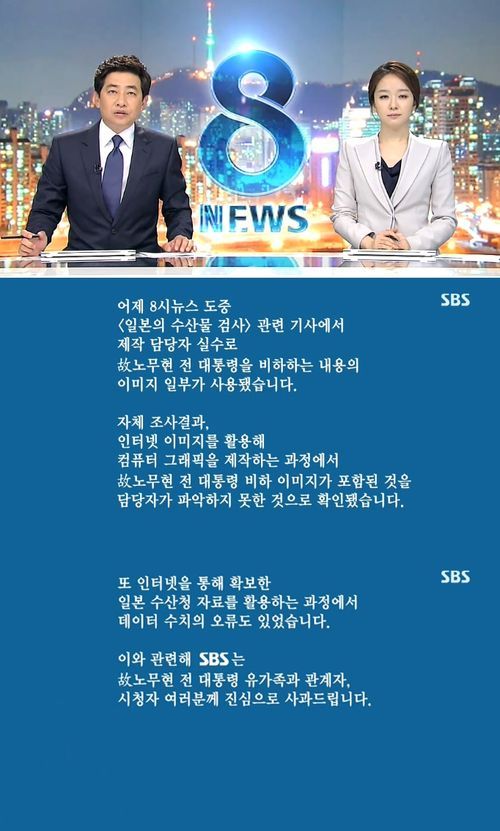 또한 해당 이미지에 표기된 수치 오류 사실도 밝혔다. “인터넷을 통해 확보한 일본 수산청 자료를 활용하는 과정에서 데이터 수치의 오류가 있었다”고 덧붙였다. 마지막으로 “이와 관련해 SBS는 고 누무현 전 대통령 유가족과 관계자, 시청자 여러분께 진심으로 사과드린다”고 유감의 뜻을 전했다.