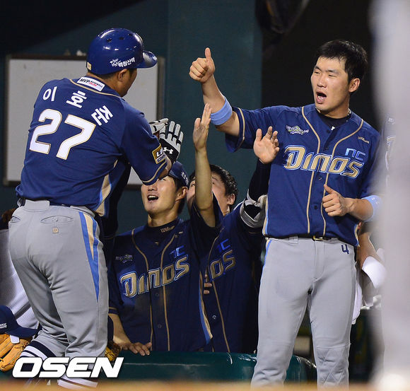 21일 오후 서울 잠실구장에서 열린 '201 한국야쿠르트 세븐 프로야구' 두산 베어스와 NC 다이노스의 경기 8회초 1사 1,2루 NC 이호준이 3점 홈런을 날리고 동료들의 축하를 받고 있다. 이호준은 전타석에서도 역전 솔로홈런을 날렸다.