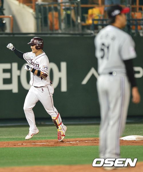 8회말 넥센 공격 무사 2, 3루 상황 6번타자 김민성이 역전 좌월 스리런포를 날리고 주먹을 불끈 쥐며 그라운드를 돌고 있다.