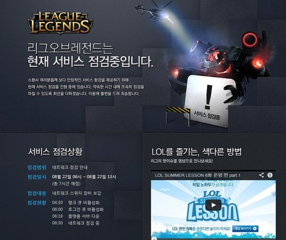 [OSEN=이슈팀] 인기 온라인 게임 '리그오브레전드'(LOL)가 22일 오전 6시부터 서비스 점검에 들어갔다. 이른바 '롤점검'이다.