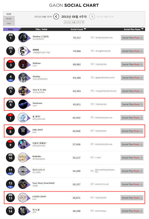 B.A.P는 8월 4주차 가온 소셜 차트 10위권에 3곡이나 랭크 시키는 기염을 토했다.
