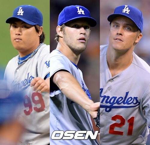 LA 다저스가 메이저리그 유일의 12승 트리오를 구축했다. 류현진(26)과 클레이튼 커쇼(25) 잭그레인키(30) 3인방이 그 주인공이다.