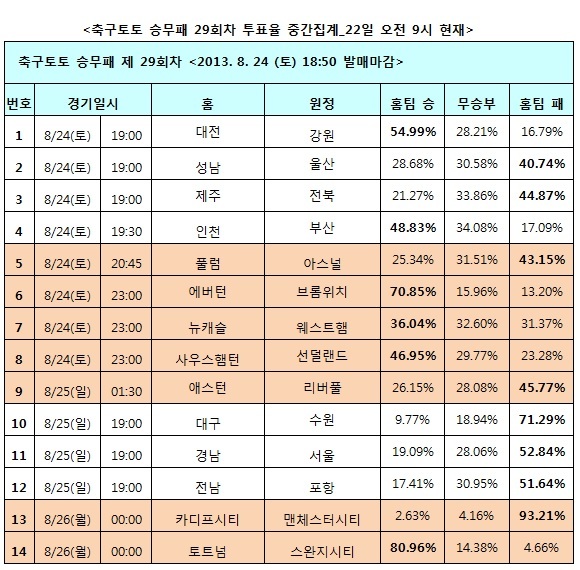 [축구토토] 국민체육진흥공단(www.kspo.or.kr)이 발행하는 체육진흥투표권 수탁사업자인 스포츠토토 온라인 공식 발매사이트 베트맨(www.betman.co.kr)은 오는 24, 25일에 열리는 국내 프로축구 K리그 클래식 7경기와 잉글랜드 프리미어리그(EPL) 7경기 등 총 14경기를 대상으로 한 축구토토 승무패 29회차 투표율 중간집계 결과, 전남-포항(12경기)전에서 국내 축구팬 51.64%는 포항이 승리를 거둘 것으로 예상했다고 밝혔다.