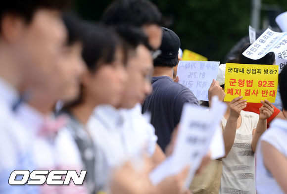 김조광수-김승환과 생각에 반대하는 동성애 및 동성결혼 합법화 반대 및 군형법 92조 폐지 반대하는 단체가 플랜카드를 들고 있다.
