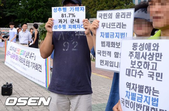성소수자 4대 인권입법과제 실현 촉구 찬성 단체와 동성애 및 동성결혼 합법화 반대 및 군형법 92조 폐지 반대하는 단체가 플랜카드를 들고 각자의 의견을 내세우고 있다.