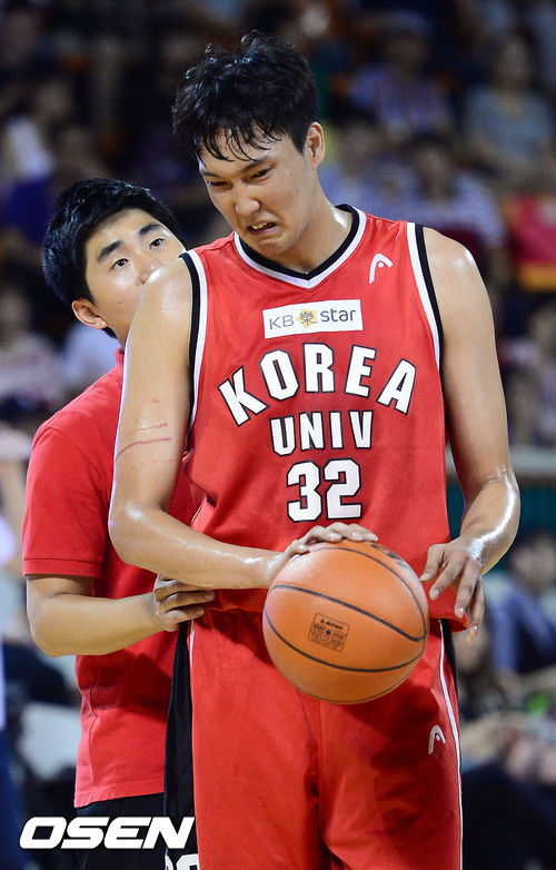 22일 오후 서울 잠실학생체육관에서 열린 2013 KB국민카드 프로-아마 최강전 결승전 상무와 고려대의 경기에 앞서 고려대 이종현이 팔에 난 상처에 고통스러워하고 있다