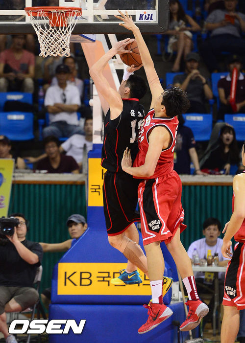 22일 오후 서울 잠실학생체육관에서 열린 2013 KB국민카드 프로-아마 최강전 결승전 상무와 고려대의 경기, 2쿼터 고려대 이종현이 상무 윤호영의 슛을 슛블록 성공하고 있다.