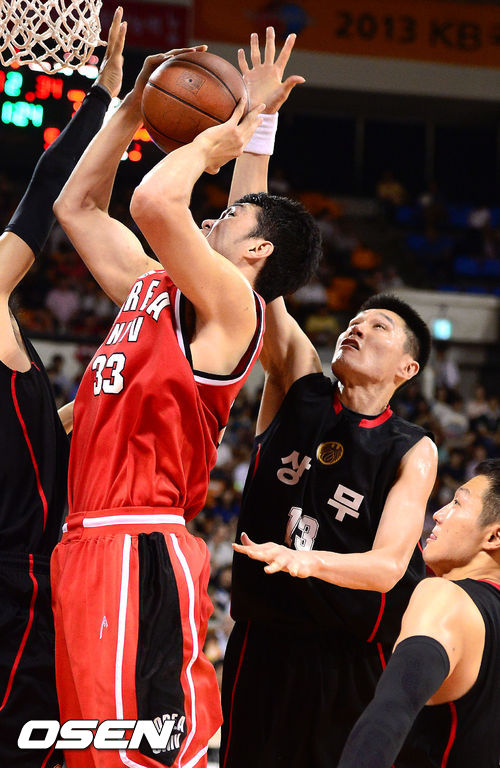 22일 오후 서울 잠실학생체육관에서 열린 2013 KB국민카드 프로-아마 최강전 결승전 상무와 고려대의 경기, 2쿼터 상무 윤호영이 고려대 이승현의 슛을 슛블록 시도하고 있다